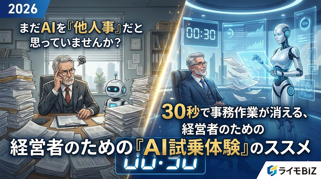 【2026年版】まだAIを『他人事』だと思っていませんか? 30秒で事務作業が消える、経営者のための『AI試乗体験』のススメ【ライモBIZ_説明5】