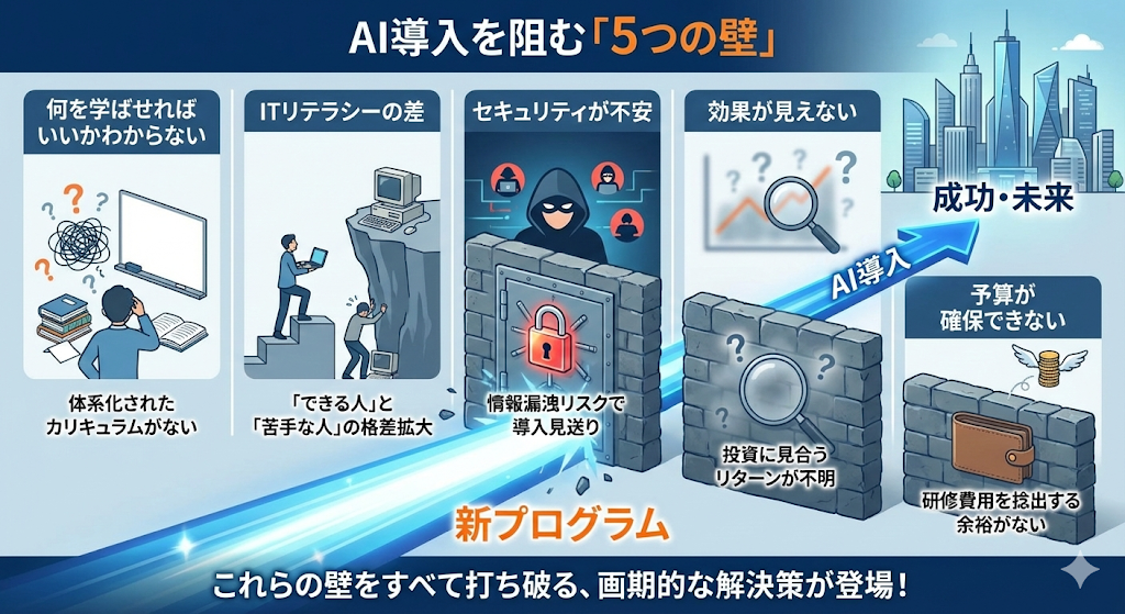 多くの企業がAIの人材育成において、以下の課題に直面しています 。