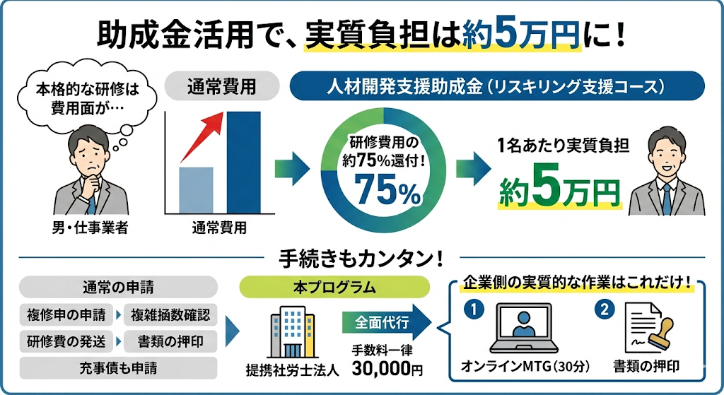 「本格的な研修は費用面が…」とご心配の経営者様、ご安心ください。 本プログラムは「人材開発支援助成金(リスキリング支援コース)」に対応しています 。 国の助成金を活用することで研修費用の約75%が還付され、実質負担は1名あたり約5万円という低コストで導入が可能です 。 さらに、面倒な助成金の申請は提携社労士法人が一律30,000円の手数料で全面代行するため、企業側の実質的な作業は本部との「オンラインMTG(30分)」と「書類の押印」程度で済みます 。