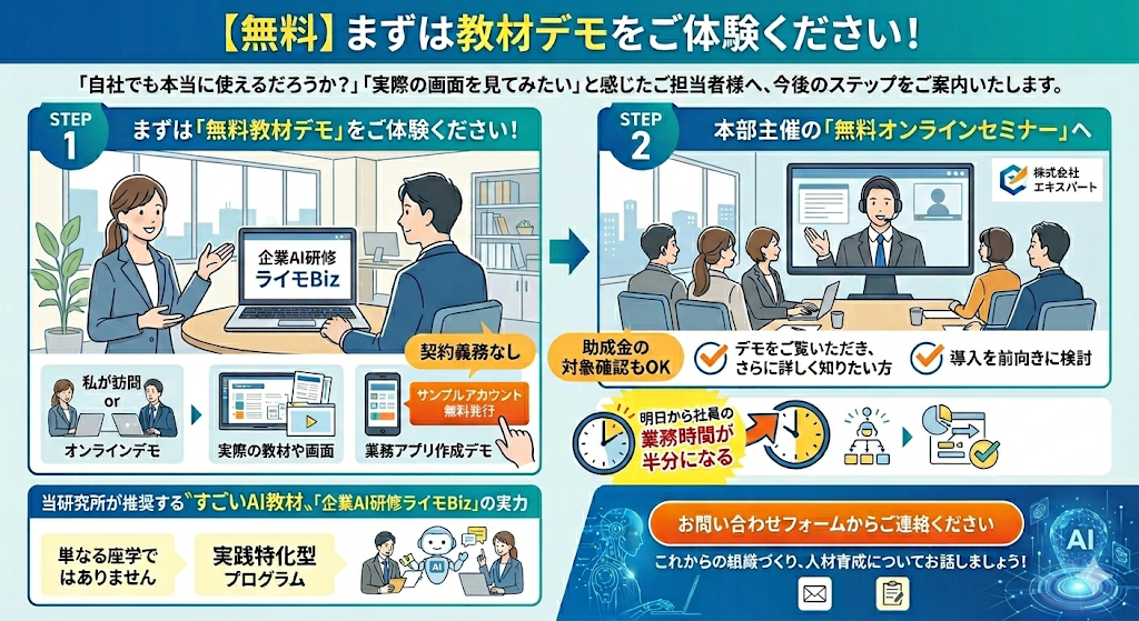 ステップ1:まずは「無料教材デモ」をご体験ください! 貴社のご予定に合わせて私が訪問させていただき、実際の研修教材「企業AI研修ライモBiz」や、どのように業務アプリが作れるのかを、デモンストレーションを交えて直接ご案内いたします。サンプルアカウントも無料で発行可能ですので、まずは「実際に触って、見て、実感」してください !