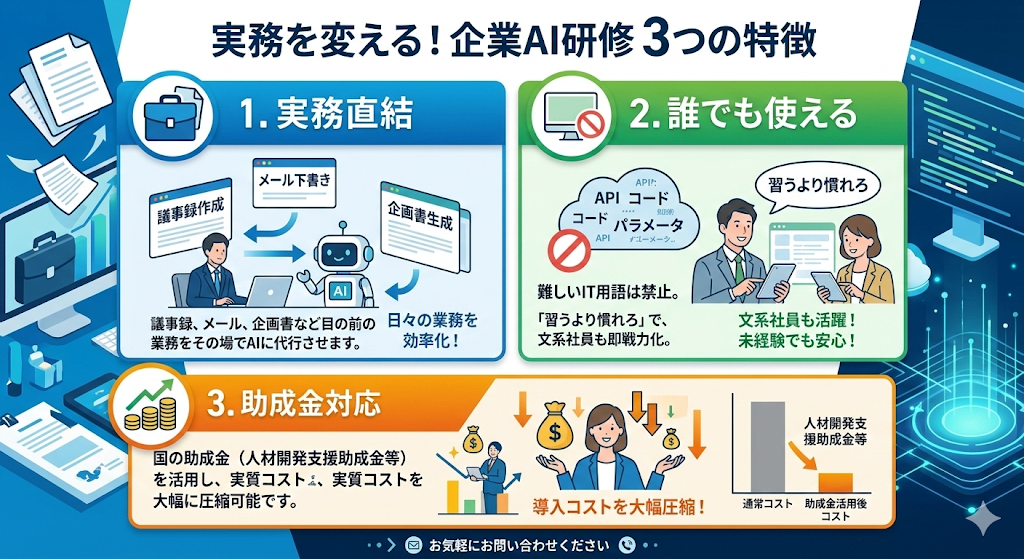 • 助成金対応: 国の助成金(人材開発支援助成金等)を活用し、実質コストを大幅に圧縮可能です。