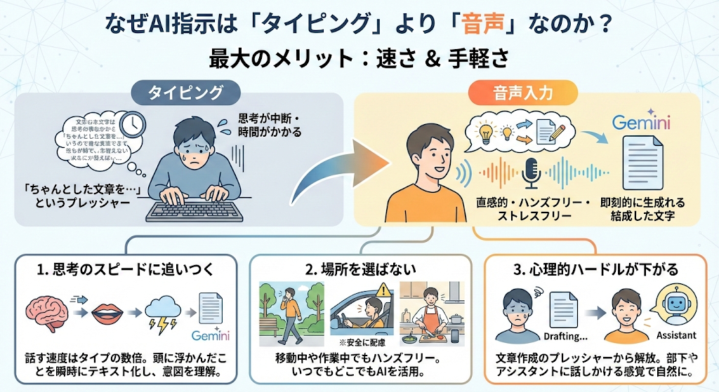 AIへの指示(プロンプト)を音声で行う最大のメリットは、シンプルに「速さ」と「手軽さ」です。