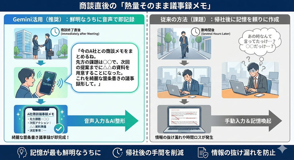 お客様との商談や打ち合わせが終わった直後、記憶が最も鮮明なうちに音声で要点を吹き込んでしまいます。