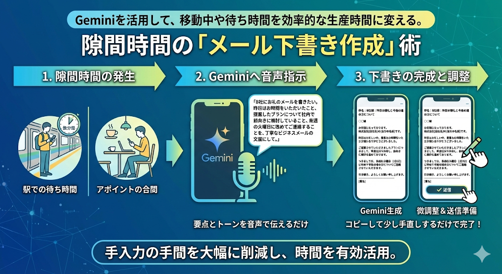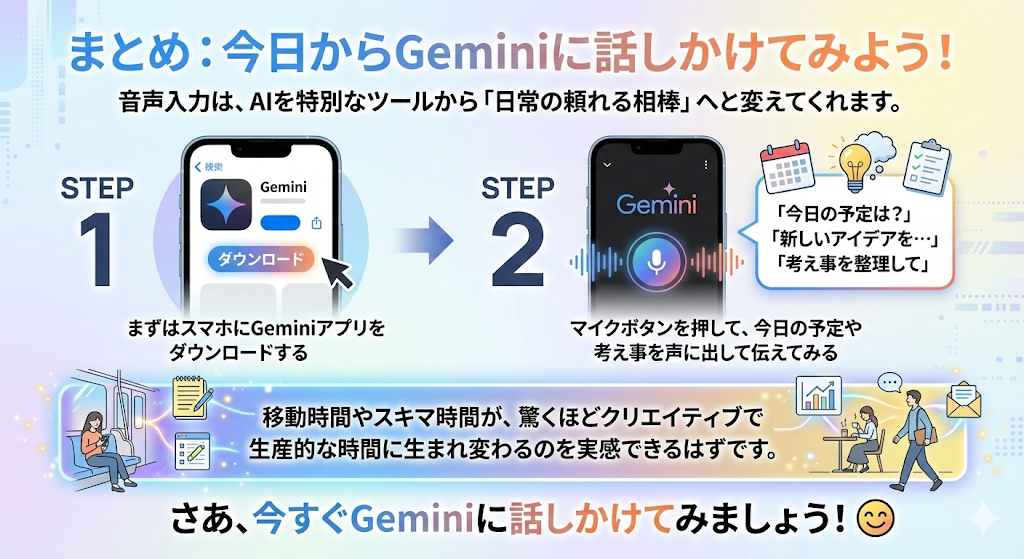 まずはこの簡単なステップから始めてみてください。移動時間やスキマ時間が、驚くほどクリエイティブで生産的な時間に生まれ変わるのを実感できるはずです。さあ、今すぐGeminiに話しかけてみましょう!