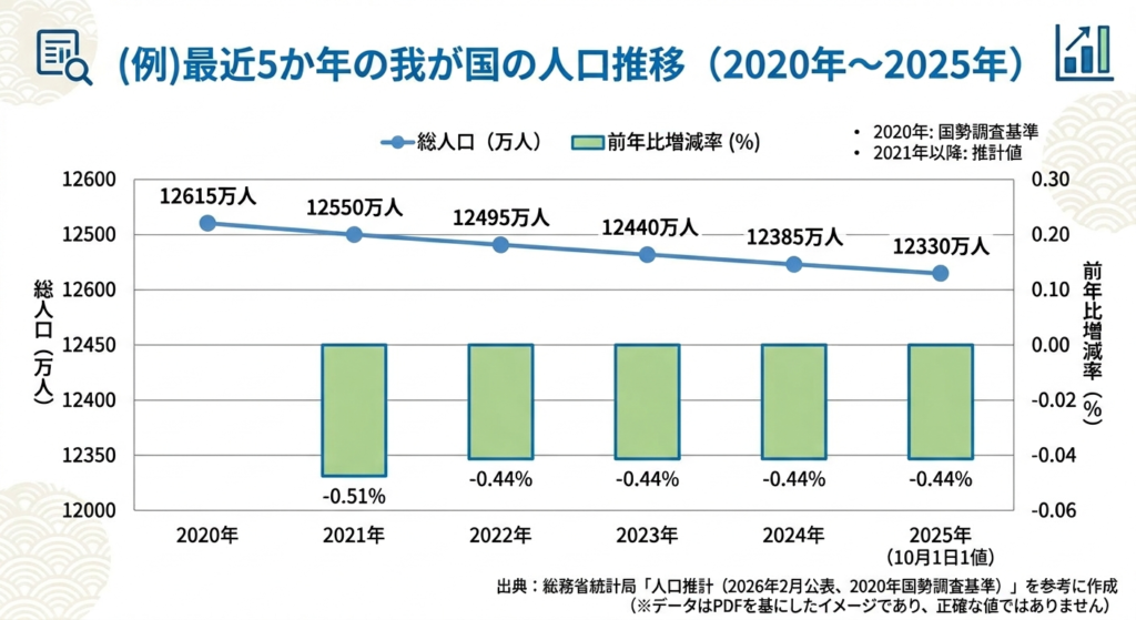 あなたは優秀なデータアナリストです。 以下のデータを使って、国勢調査2020年から2025年までにおける「(例)最近5か年の我が国の人口推移」というタイトルのグラフを作成してください。 初心者にもパッと見て傾向がわかるように、適切なグラフの種類(棒グラフ、円グラフ、折れ線グラフなど)を自動で選んでください。なお、2021年から2025年のデータは10月1日現在のデータを用いてください。さらに、左の軸を人口値、右軸を増減率として、人口推移のみならず、各年増減率も添えてグラフ化してください。【データ】 (人口推計 2026年(令和8年)2月報)