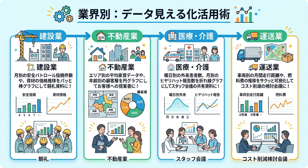 - 🏗️ 建設業: 月別の安全パトロール指摘件数や、資材の価格推移をパッと棒グラフにして朝礼資料に!